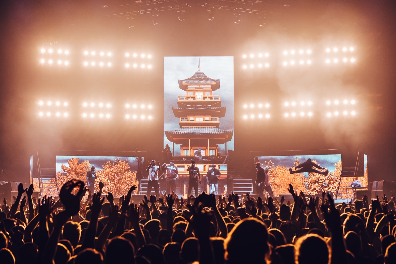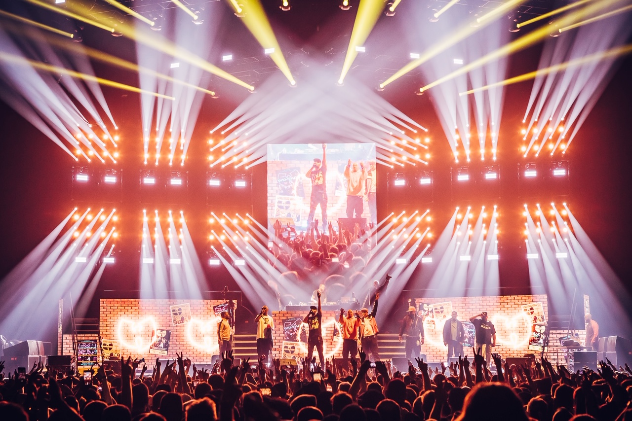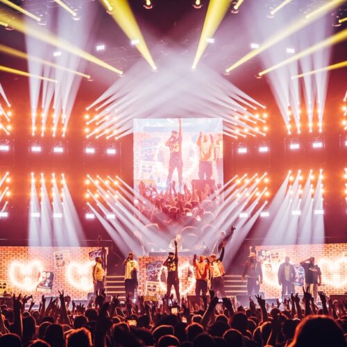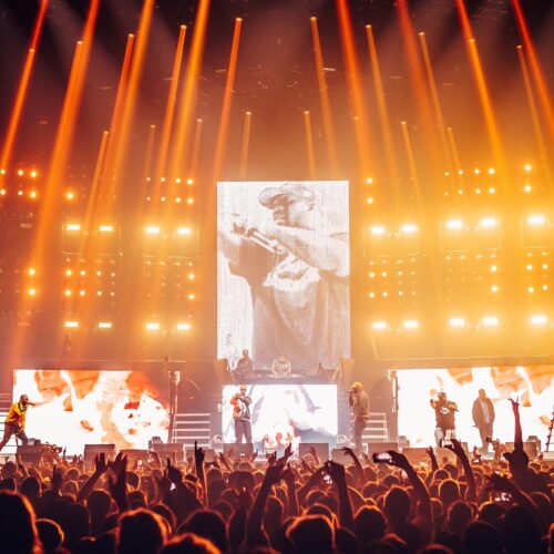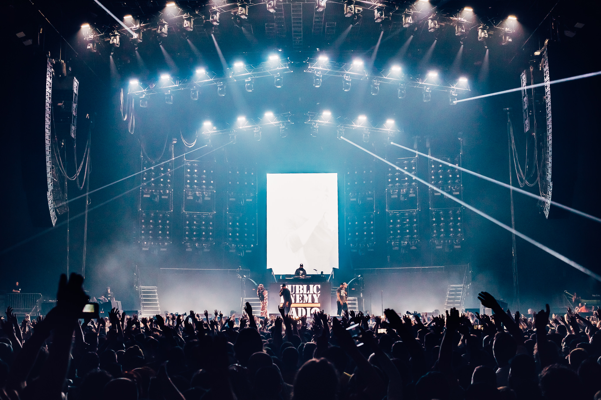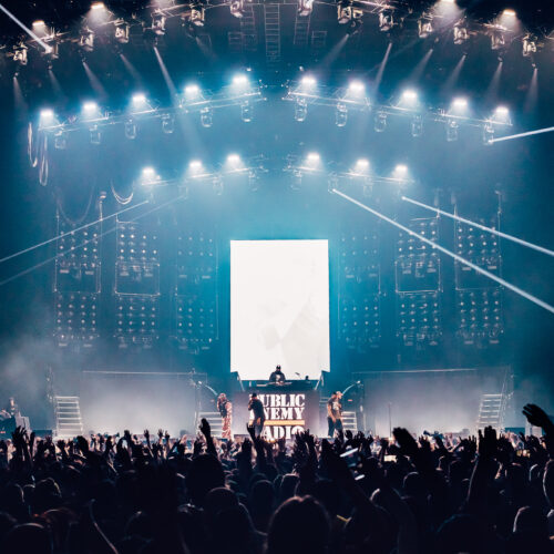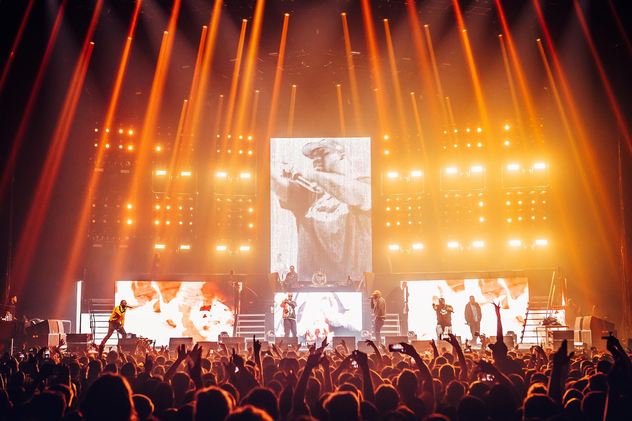 Our 60′ high production design featured a wall of lights, immersive video content and a sprawling multi-level stage layout that played host to Wutang Clan, Public Enemy and De La Soul as they tore it up around Europe for the arena-filling Gods of Rap tour. Complete production + visual + lighting design by us.