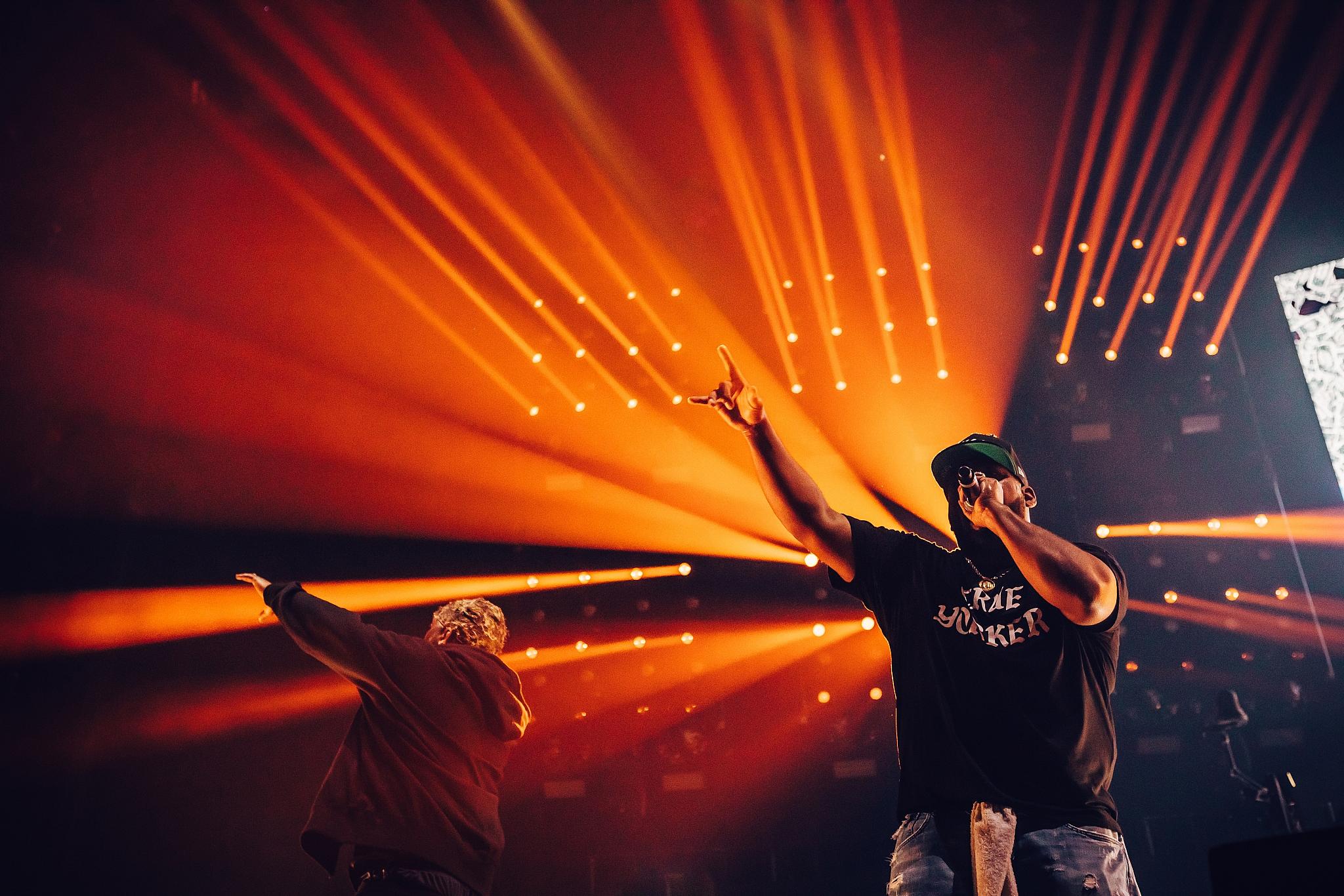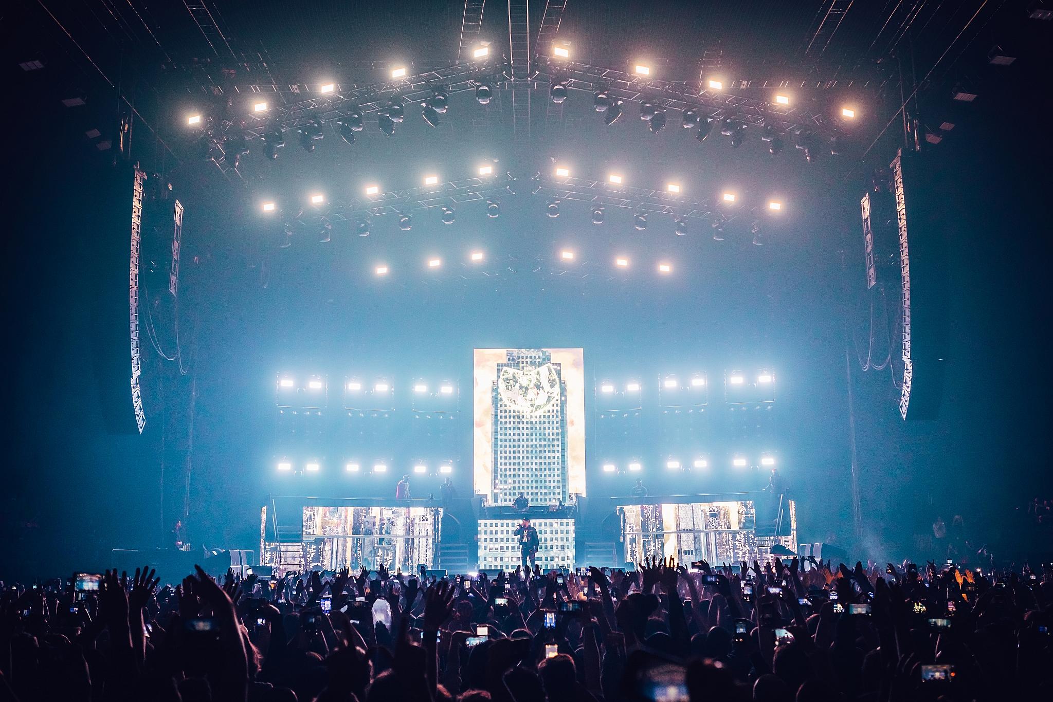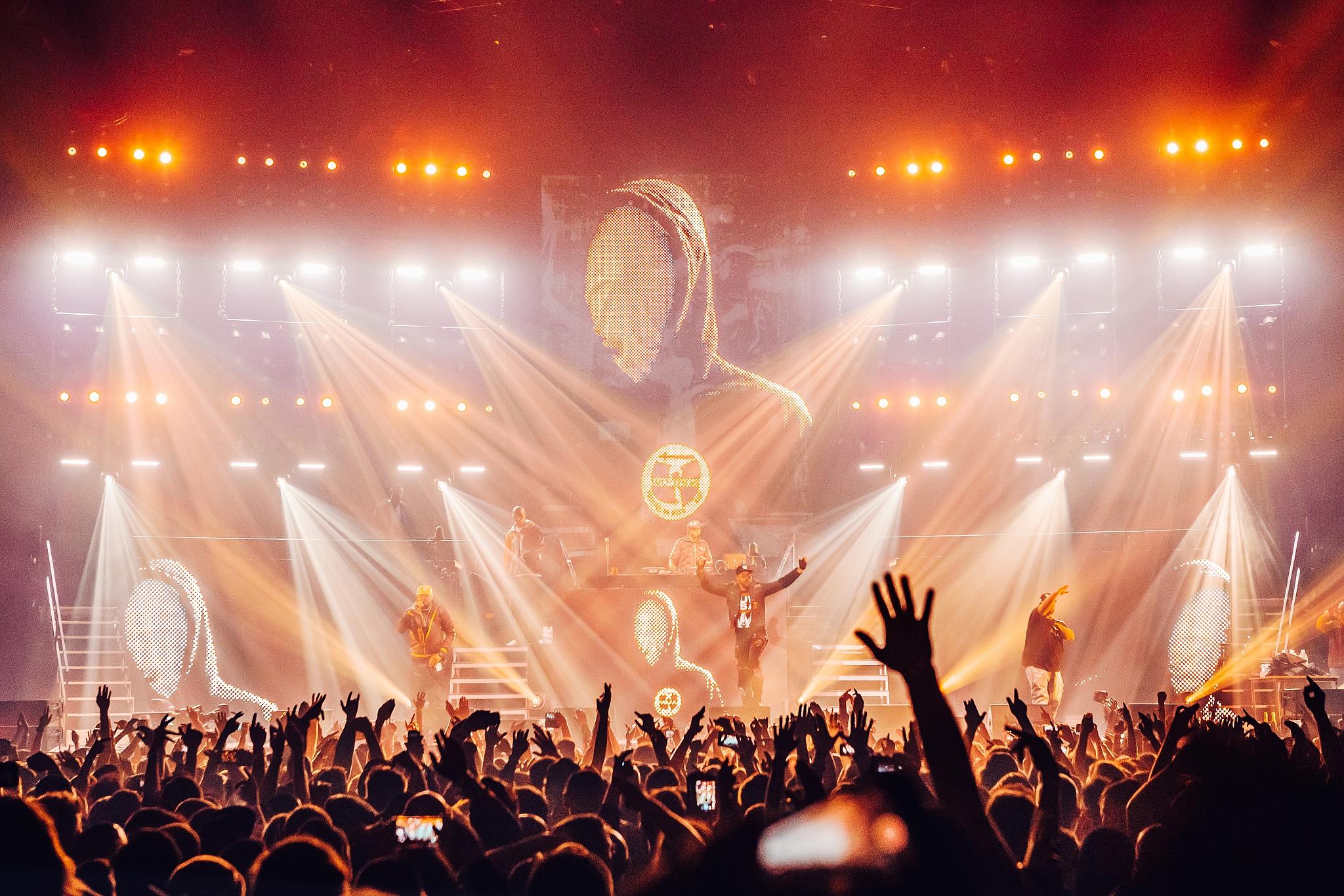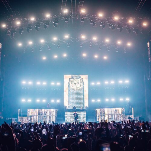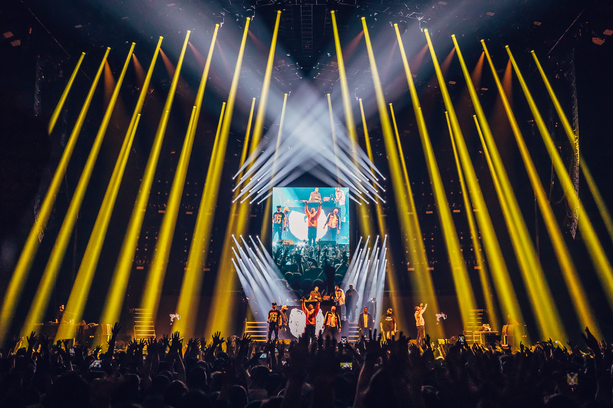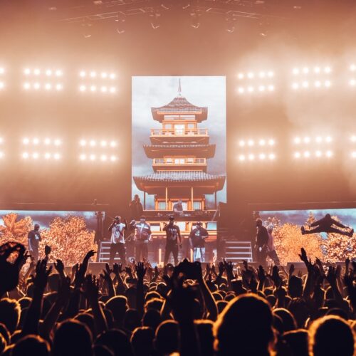 Our 60′ high production design featured a wall of lights, immersive video content and a sprawling multi-level stage layout that played host to Wutang Clan, Public Enemy and De La Soul as they tore it up around Europe for the arena-filling Gods of Rap tour. Complete production + visual + lighting design by us.