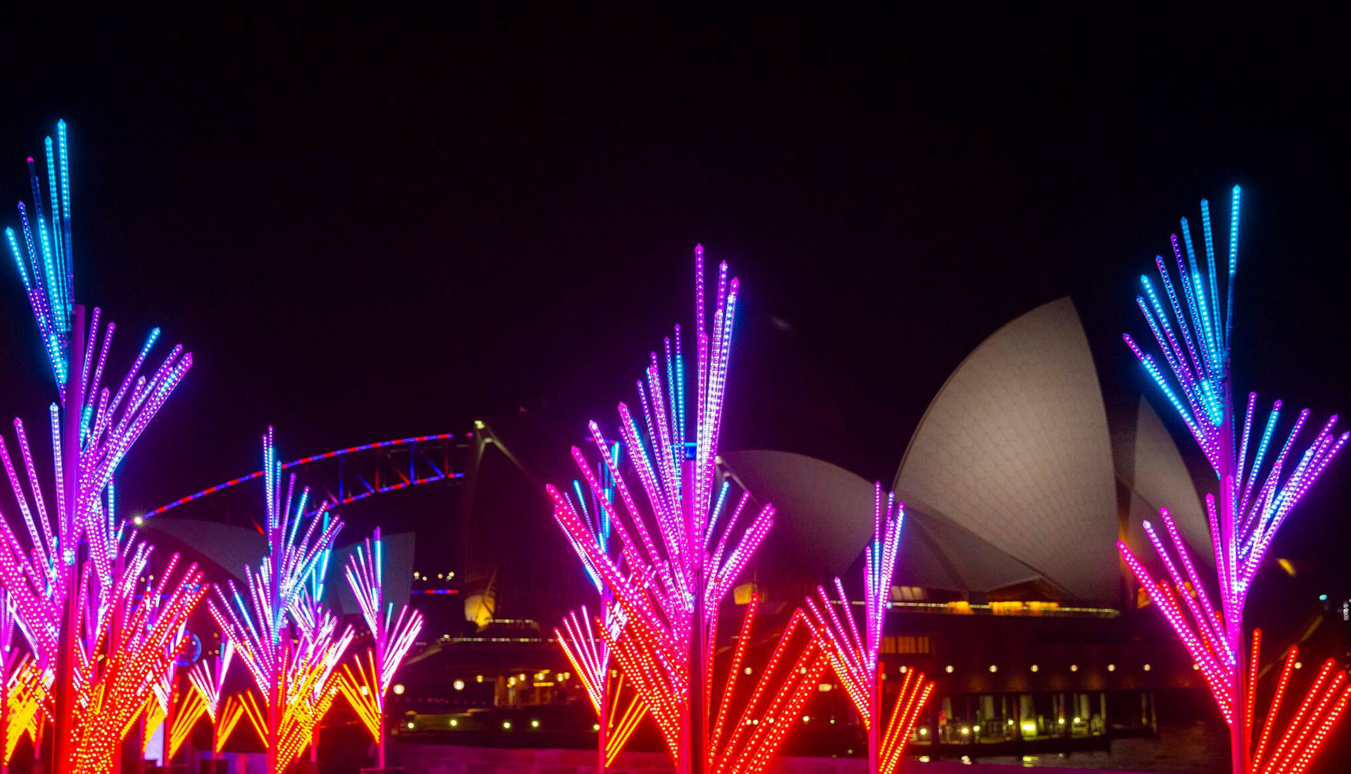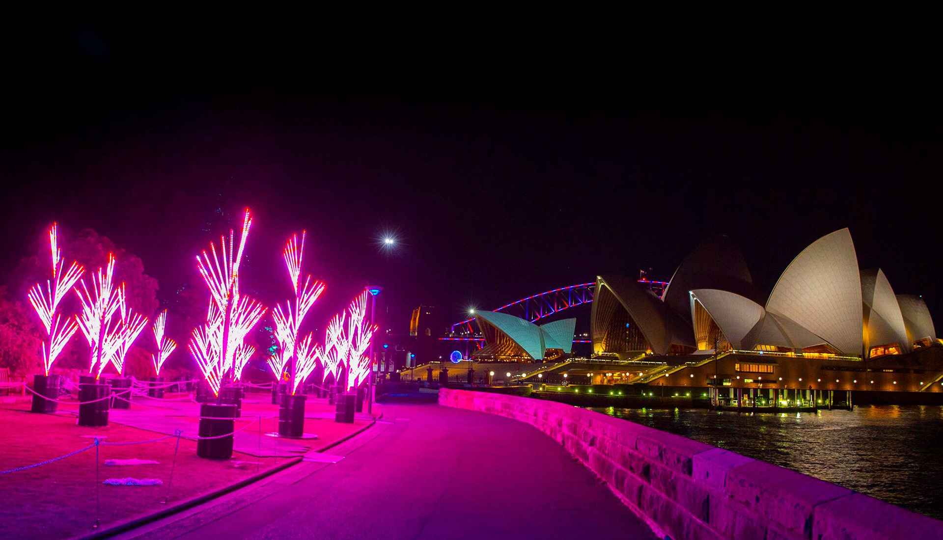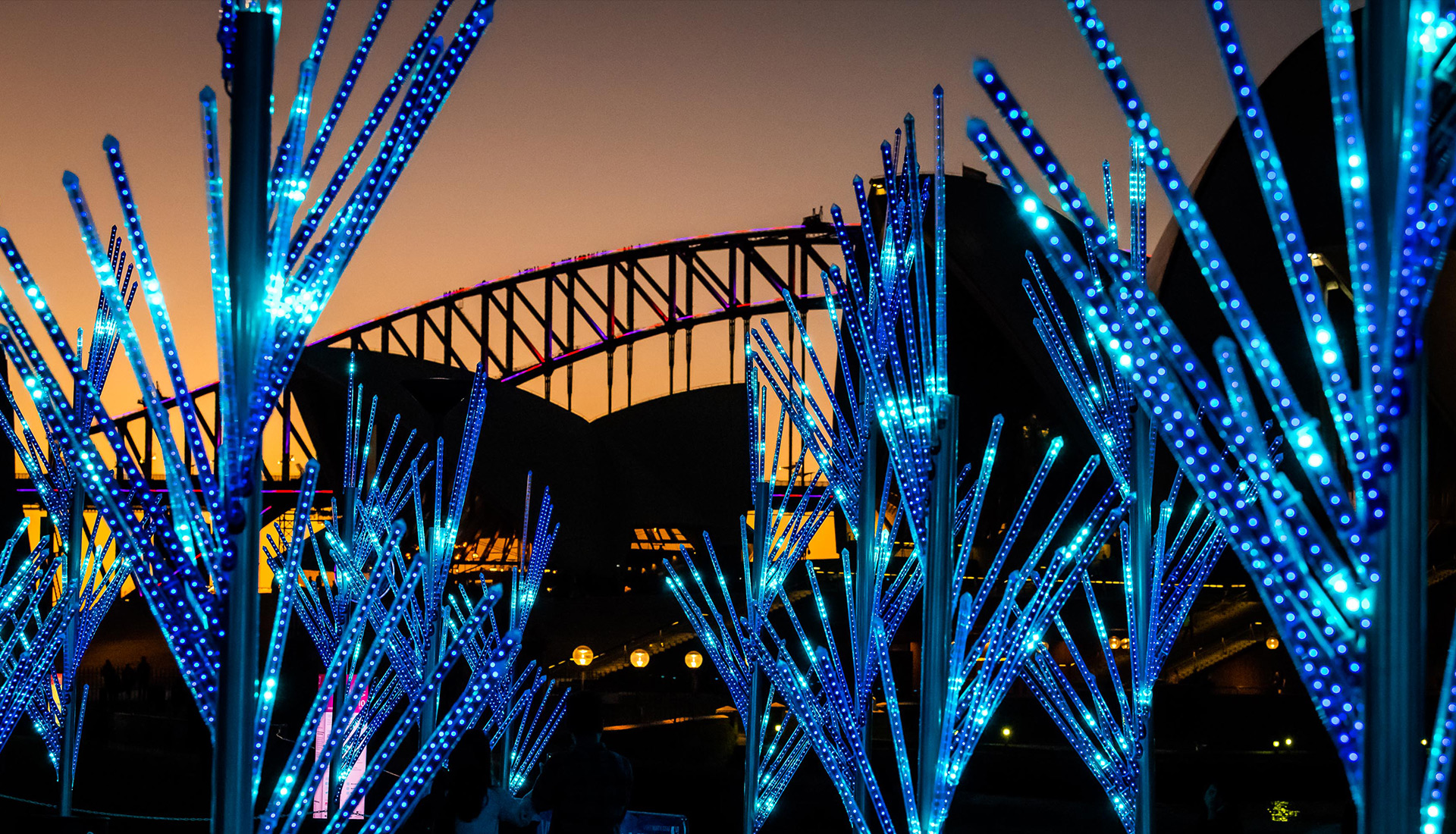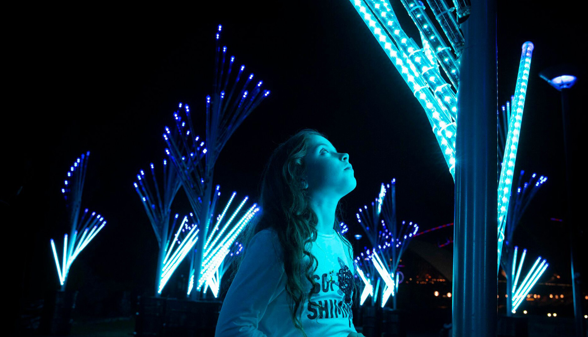 The Nautilus Forest draws from both nature and precise geometry to create an illuminated forest of spiralling trees. The captivating and hypnotic form of the spiral has long been a source of magic and fascination to humankind. The subject of lengthy mathematic study and the inspiration for much ornamentation, the spiral is an untamed, organic phenomena, but perfect in its reasoned geometry. The branches of the forest ripple and pulse with colour. Sometimes shooting off in independent patterns, sometimes rippling as one unified tree and sometimes sweeping magnificent hues of light across the whole forest. With more than 40,000 individually controlled RGB pixels at their disposal, the forest’s programmers can take full advantage of its intrinsic forms.