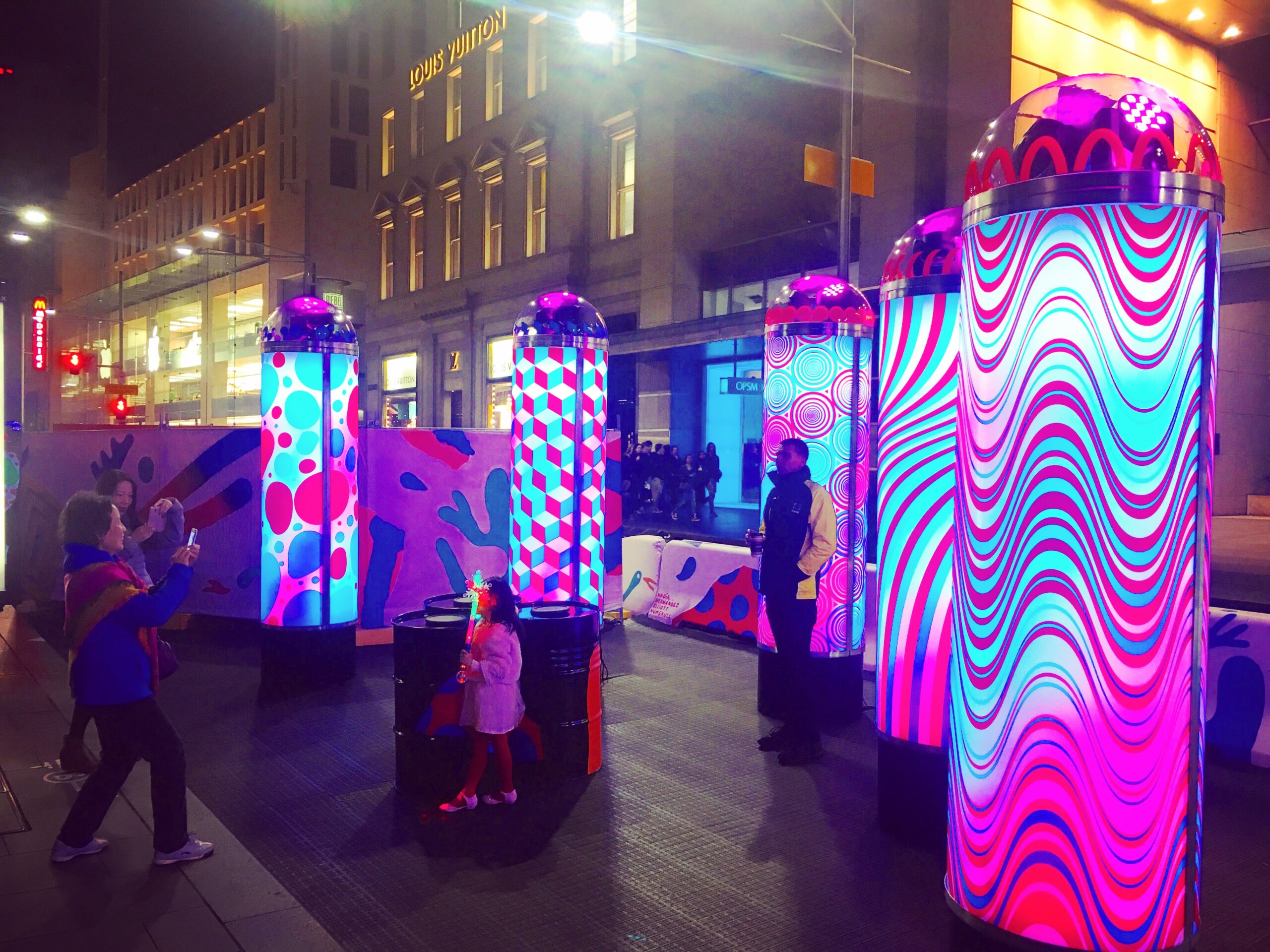 Originally created for Transport for NSW as part of the Sydney Light Rail activation program, the Pillars are a series of eighteen, internally illuminated and highly customisable 2.4m high artworks. Designed to be either clad around standard city smart pole infrastructure or stand alone on custom-made concrete ballasts, the pillars can be branded in an infinite number of ways, backlit by 144 pixels of individually controllable LED lights. Attachments for the tops of each pillar can include moving lights or sculptural elements, and interactive control options are also available.