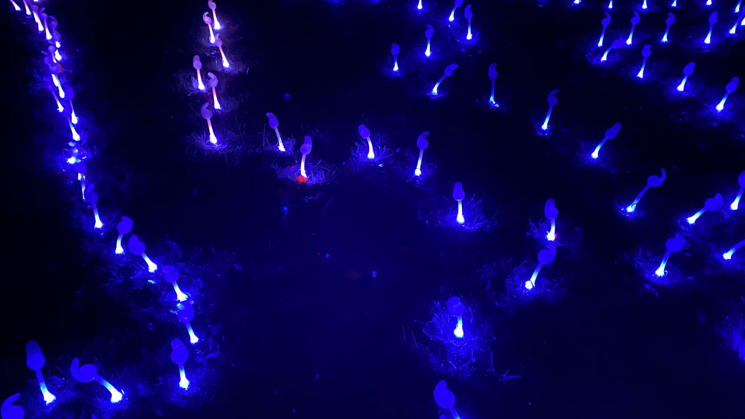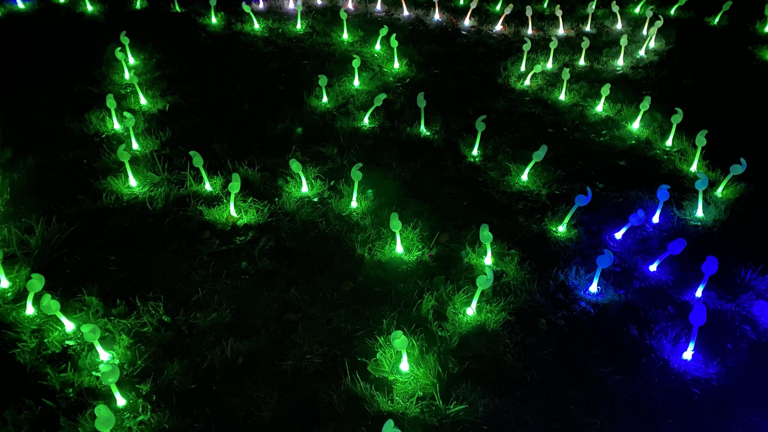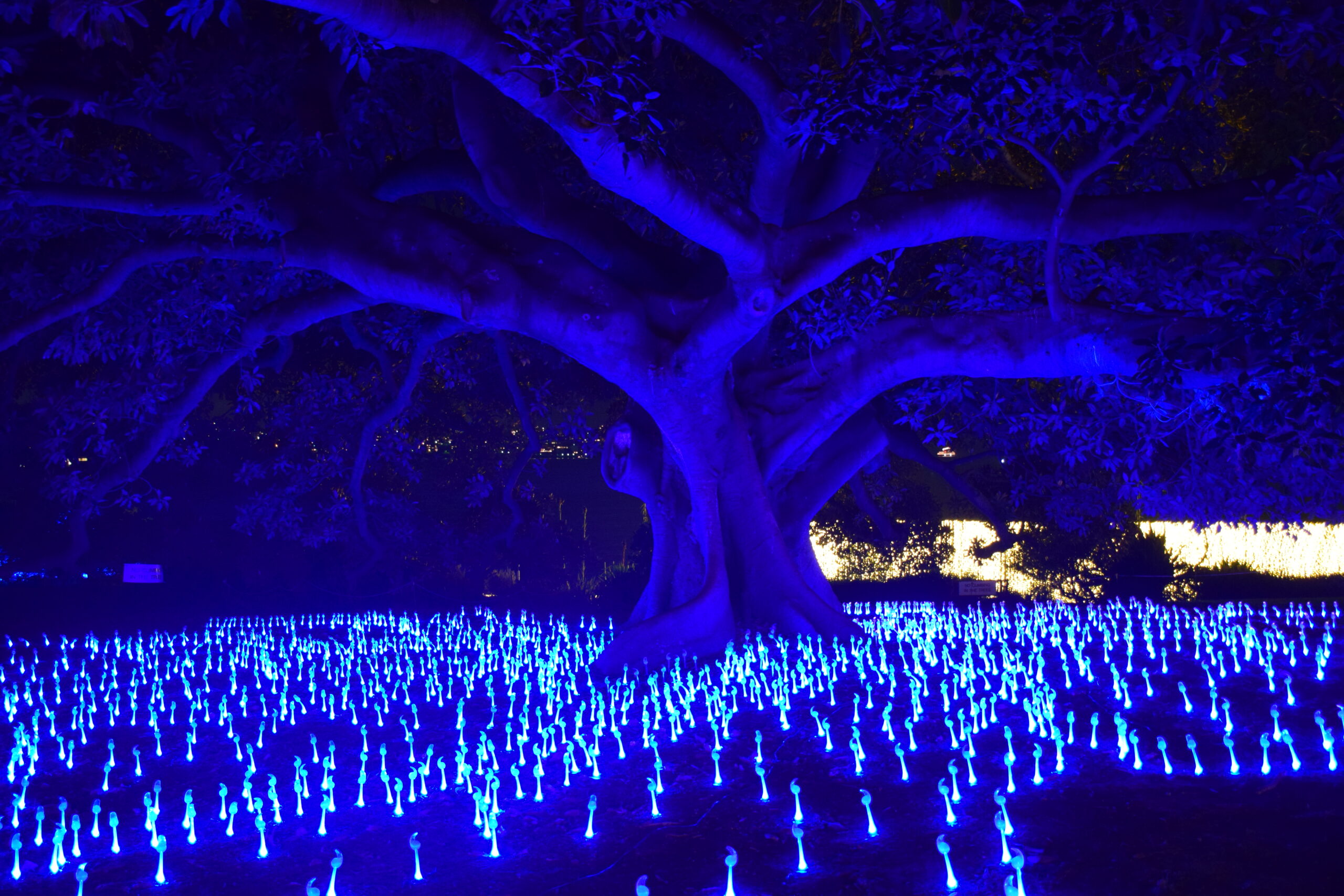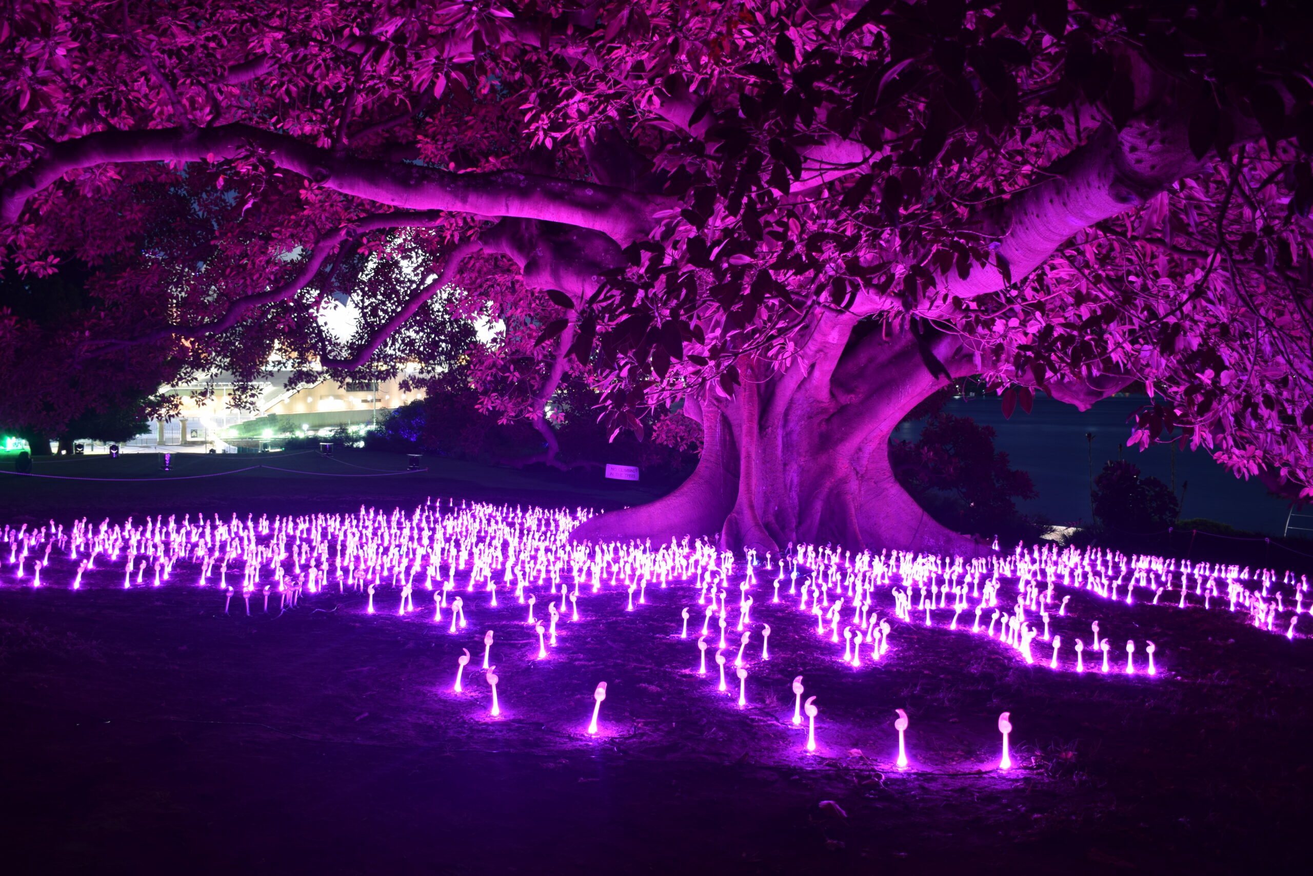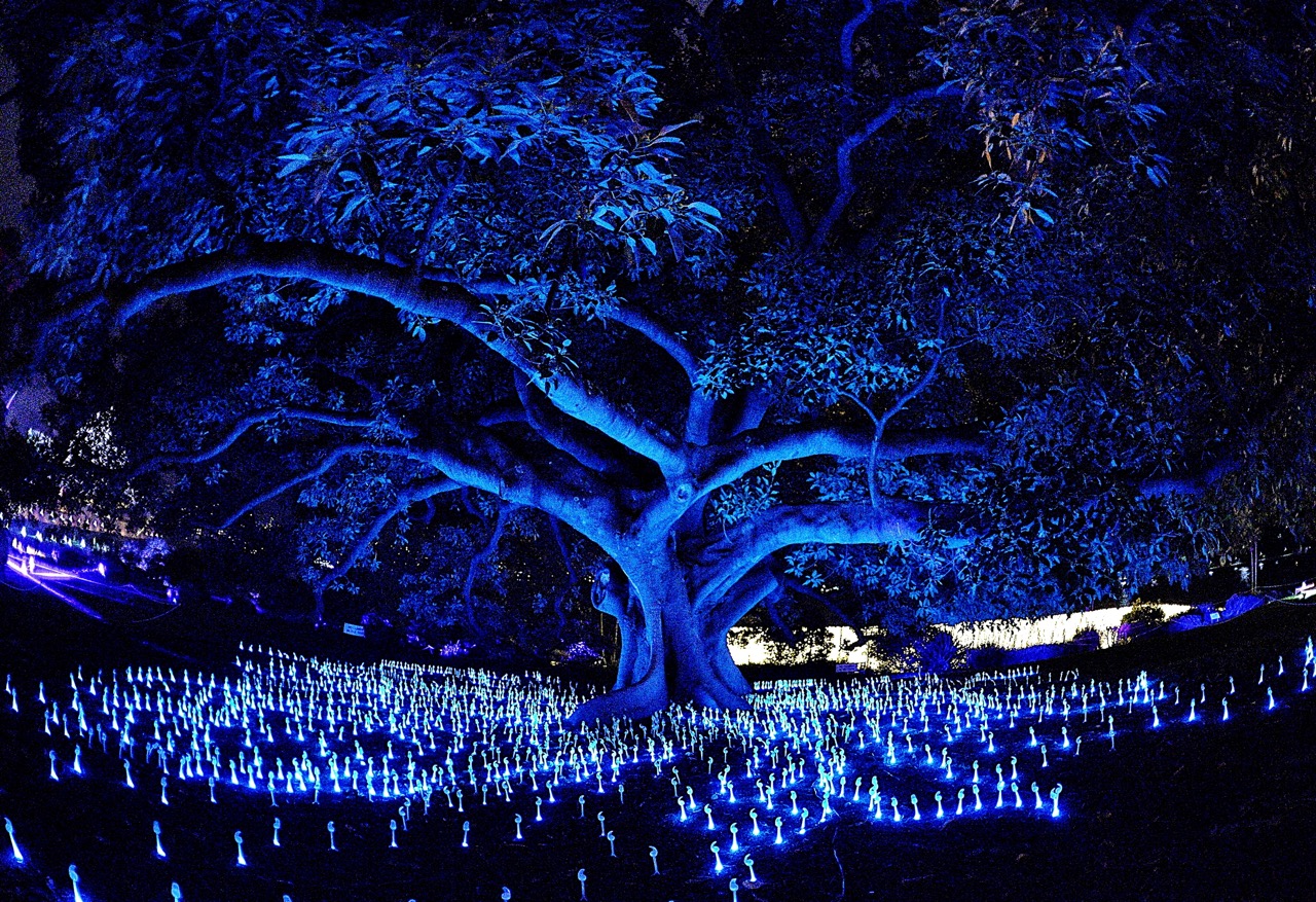The branches of a sprawling tree provide refuge for a countless number of mysterious, glowing entities known only as the Will o’ the Wisps. In the dark of night, their form is never truly revealed–instead they glow softly, appearing and disappearing seemingly at random. The ‘wisps’ draw their energy from folklore and legends born from every corner of the world: they are known as fairy fire by Welsh travellers, as Aleya by Bengali fisherman, as luces del tesoro in Mexico and as min min lights in Australia. Within the installation the wisps perform individually and reflect their different origins; they appear as devilish displays of red mischief, or elusive soft glowing orbs or burst forth as explosions of vibrant colour. Within the context of the artwork the wisps are a visual metaphor; by constantly appearing and disappearing they represent seemingly impossible-to-reach hopes or goals.